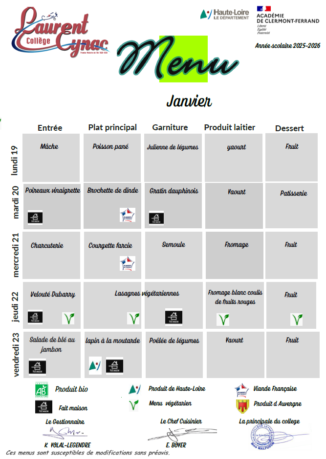 Menus du Collège Laurent Eynac - Année Scolaire 2025-2026
